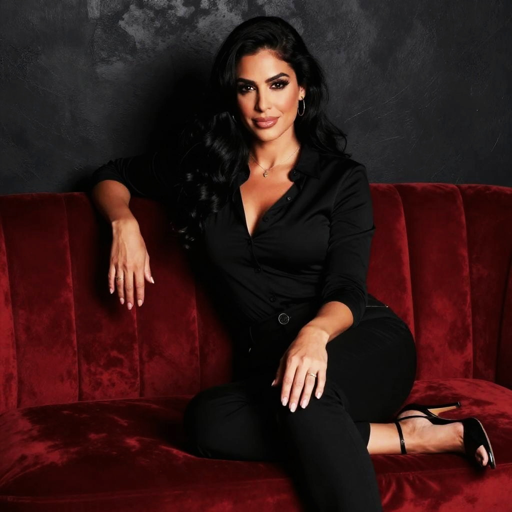 Photograph of a sexy woman with long, wavy black hair and dark, smoky eye makeup, sitting on a red velvet couch. She's wearing a low-cut, black button-up shirt that shows some cleavage, black pants, and black high heels. She's smiling subtly, with one hand touching her hair and the other resting on her knee. The background is a plain black wall, making her stand out.