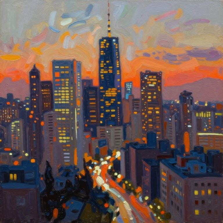 Vibrant cityscape painting of a skyscraper-laden skyline at dusk, with glowing orange and purple skies, illuminated buildings, and busy streetlights
