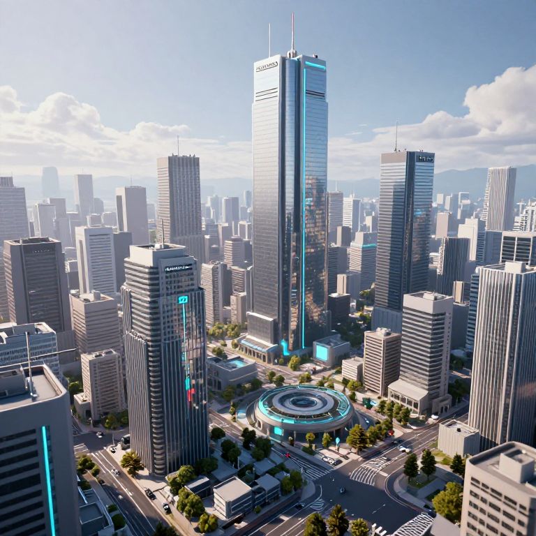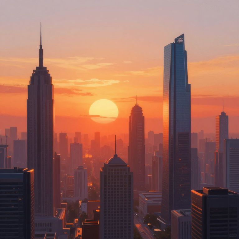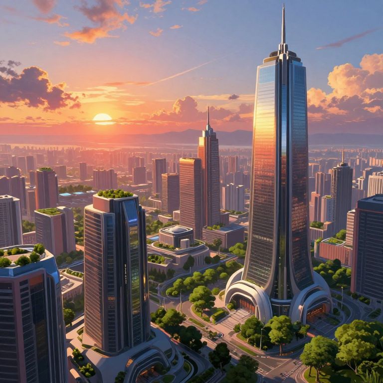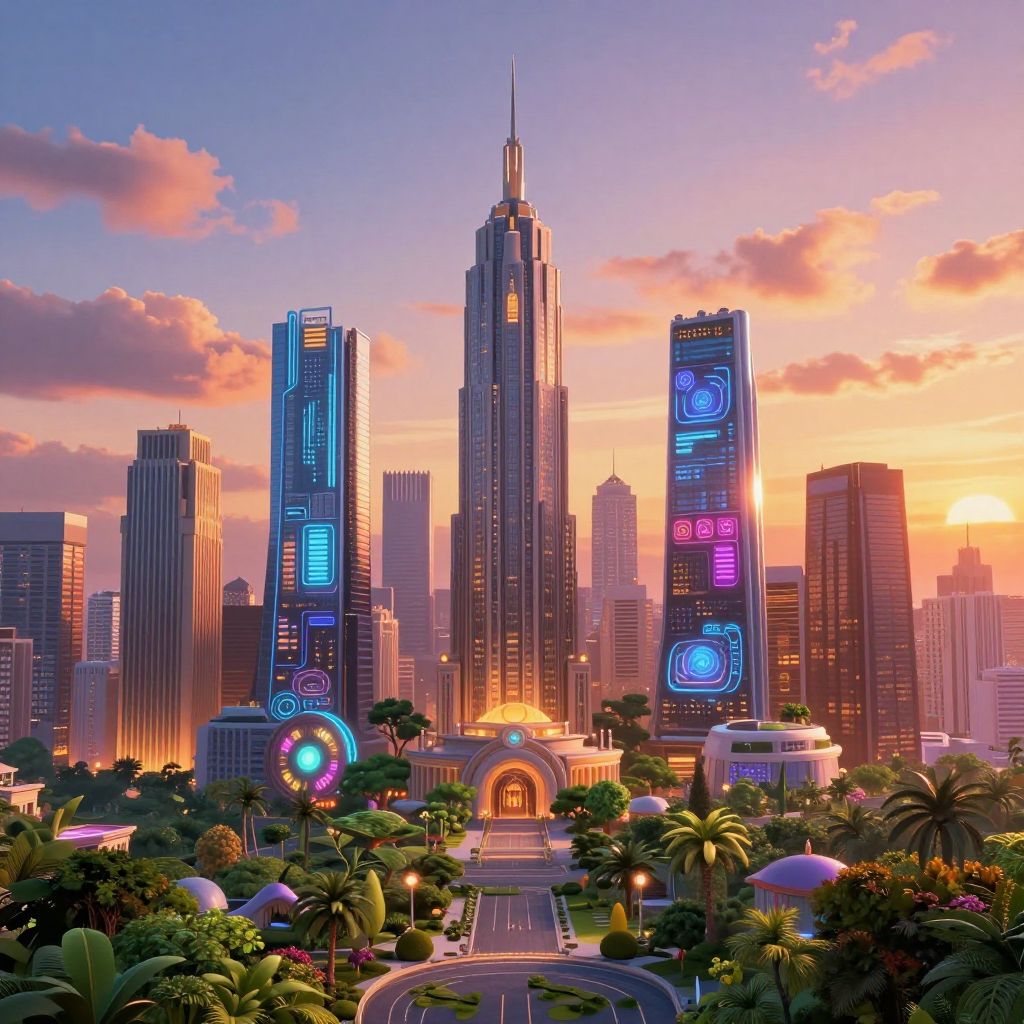 Desde a high vantage point, a sprawling futuristic cityscape unfolds under a vibrant sunset sky, blending advanced skyscrapers with lush greenery, in a vivid, detailed digital painting style.