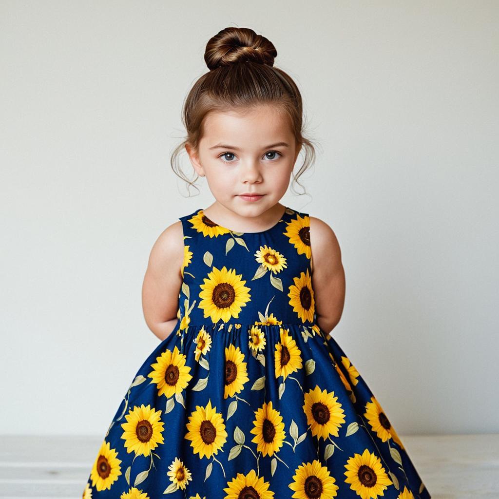 Toddler announcement outfit,1girl, solo, sunflower, dress, flower, blue eyes, realistic, brown hair, hair bun, floral print, child, arms behind back