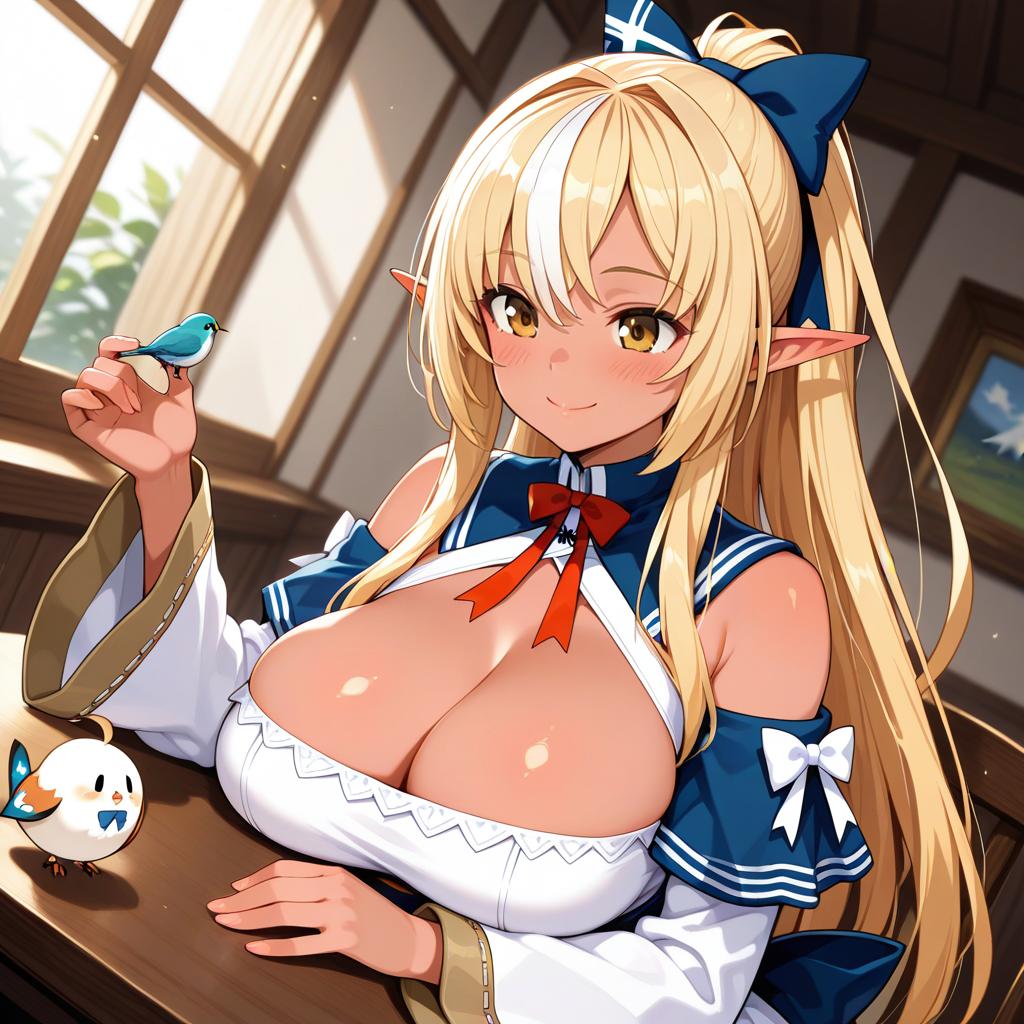 Elfriend (shiranui flare), hololive, 1girl, dark-skinned female, red eyes, orange eyes, streaked hair, blonde hair, long hair, white hair, sidelocks, ponytail, high ponytail, hair bow, large breasts, cleavage, white dress, blue bow, bare shoulders, detached sleeves, long sleeves, virtual youtuber, virtual youtuber, elf, bird, dark elf, by artist lolita channel, illustrious
