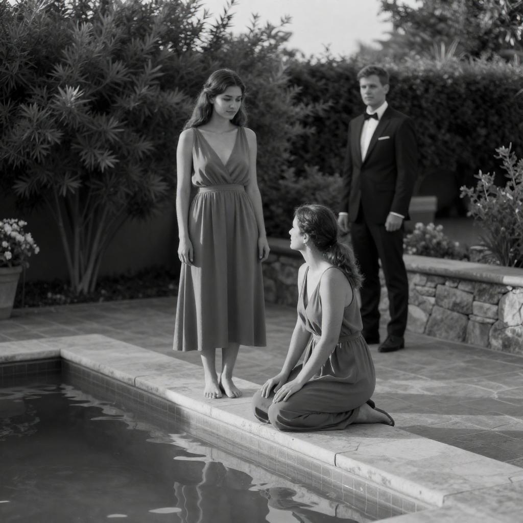 Black and white photograph. Three people by a small pool. Two women and one man. One woman stands, one kneels by the pool, the third man stands in the background. Evening light, garden setting. Bushes, stone walls, pool edge. Kneeling woman's hair tied back, wearing a dress. Standing woman's dress flowing. Man in background wearing suit and bow tie. Shadows and light create contrast.