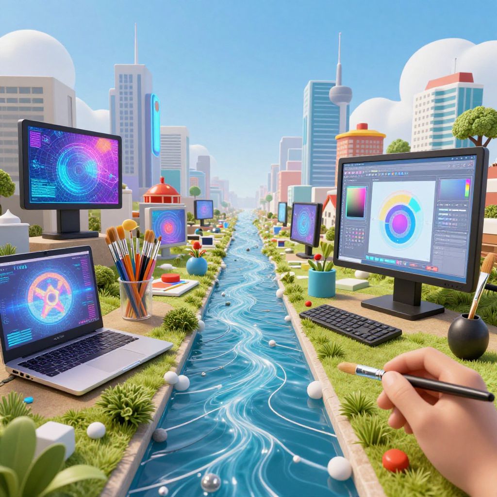 Digital artwork depicting a vibrant cityscape with a central, winding blue river flanked by grassy banks. Multiple digital devices, including laptops and monitors, display colorful, circular interfaces. A hand holds a pen near a monitor on the right. Buildings with modern architecture and white domes rise in the background. Art supplies, such as brushes, are scattered near the river. The scene blends nature and technology, with vivid blue skies and bright sunlight enhancing the futuristic, whimsical atmosphere.