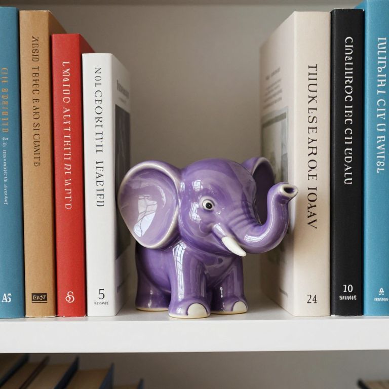 Expressive eyes, perfect face Imagine a tidy bookshelf filled with an array of books, their spines showcasing various titles and colors, Nestled at the end of one row of books is a tiny purple ceramic elephant, The elephant stands proudly, its small stature belying its sturdy purpose, The ceramic elephant is delicately crafted, with smooth, polished surfaces that reflect light softly, Its rich purple hue adds a touch of vibrancy to the bookshelf, contrasting beautifully with the earth tones of the book covers, The elephant's tiny trunk curls upwards in a friendly gesture, and its small, rounded ears add to its charming appearance, Despite its small size, the elephant effectively holds the books upright, preventing them from toppling over, Its presence adds a whimsical and colorful touch to the otherwise orderly arrangement, making the bookshelf not just a storage space, but a display of personality and taste