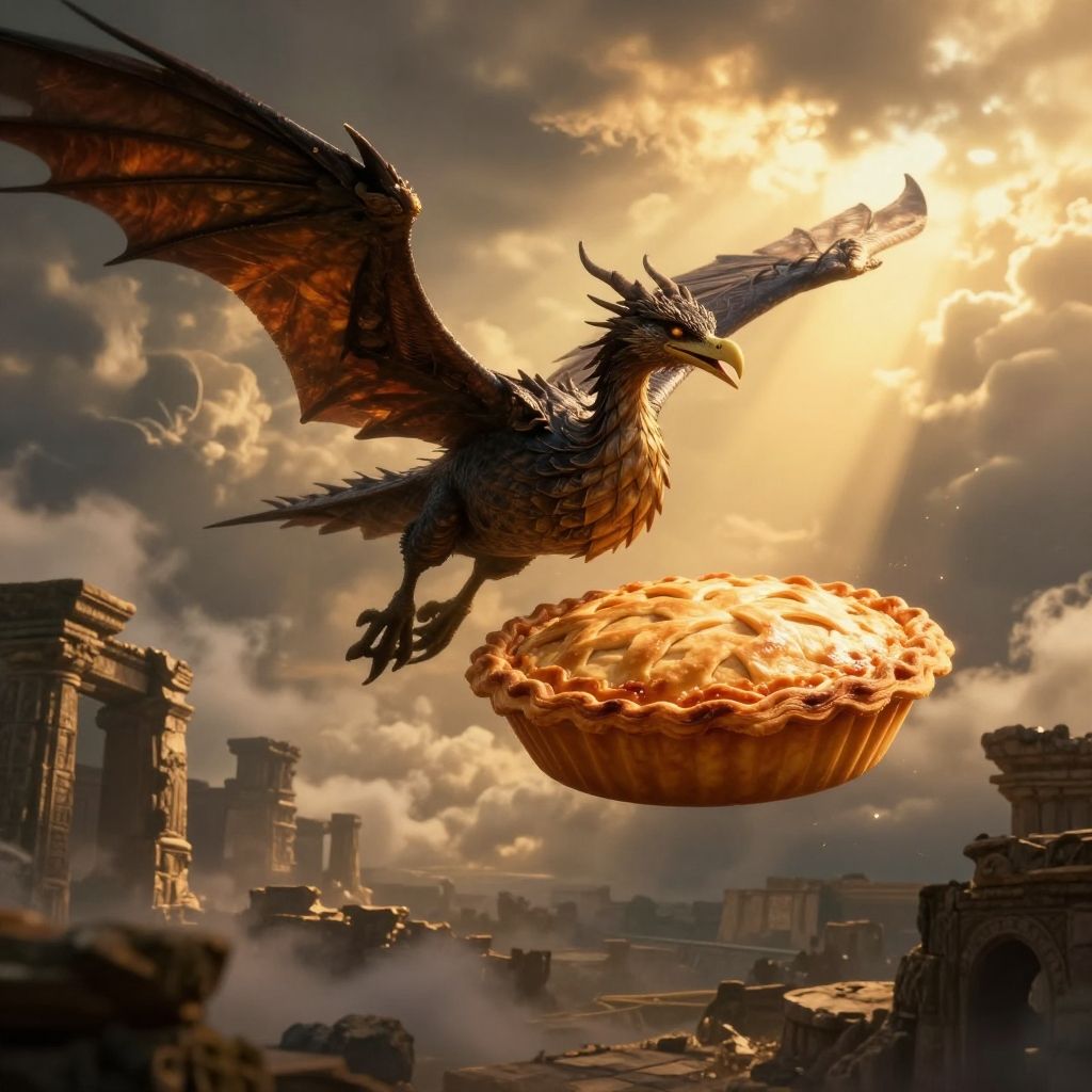 Epic scene of drake floating pie soaring over ancient ruins, dramatic clouds and golden light rays, cinematic composition, intricate textures on the drake and pie, fantasy realism