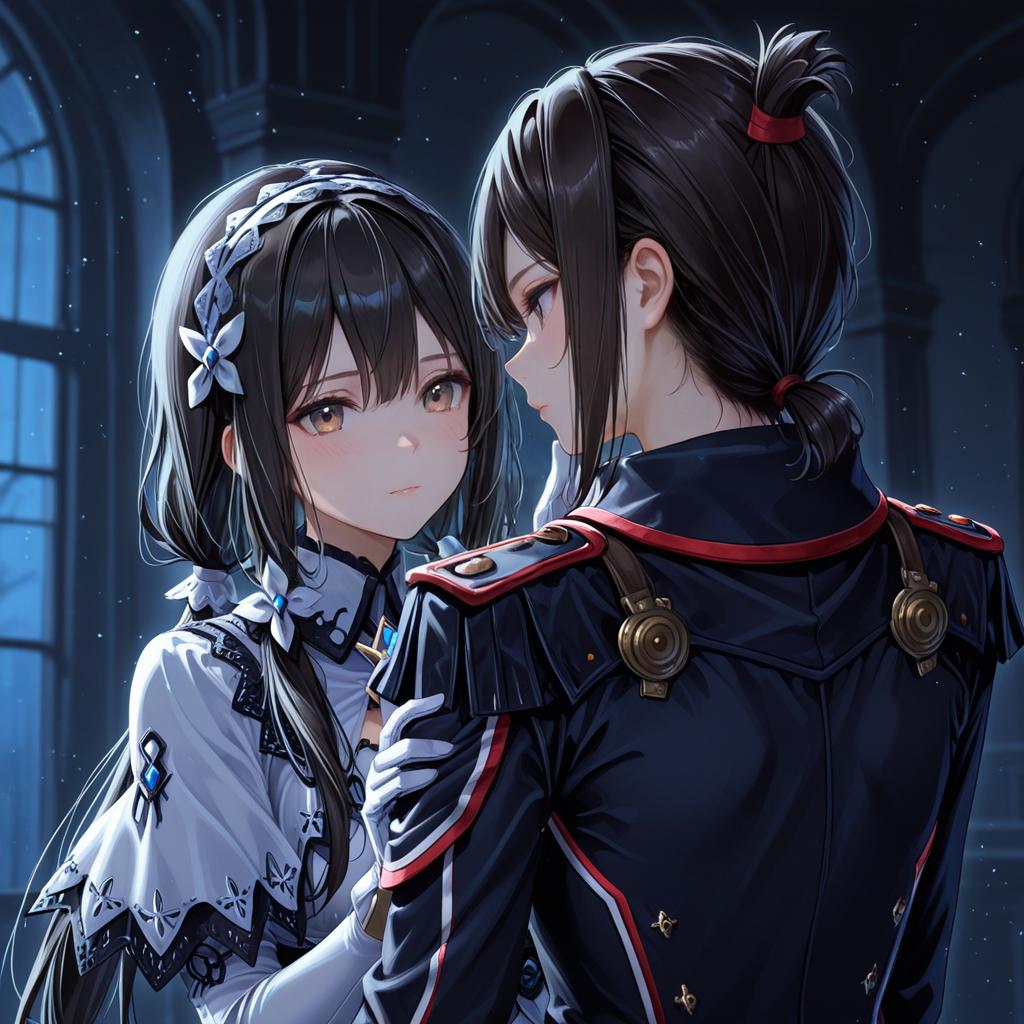 Digital anime-style illustration featuring a sad brown-haired girl with short hair and brown eyes, dressed in a detailed school-style uniform with a red tie and black vest. She is sitting in a dimly lit room, visibly emotional, wiping tears from her eyes, while a boy with brown hair and long-sleeved white shirt stands beside her offering comfort. The setting has a dark, ornate background, emphasizing the intimate and poignant moment.