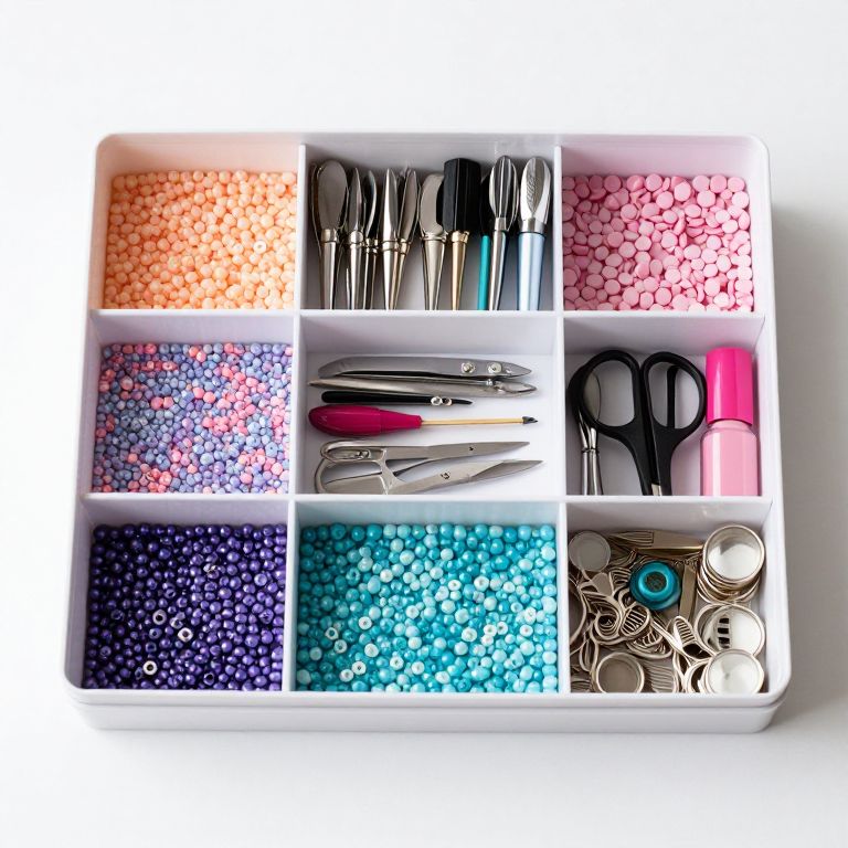 Organized storage box featuring ten compartments filled with colorful beads, nail art tools, scissors, and accessories, showcasing efficient manicure and jewelry organization.