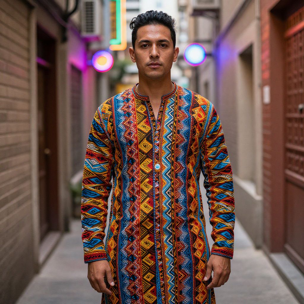 A striking portrait of a man dressed in a vibrant, geometric-patterned outfit, standing confidently in a narrow alleyway illuminated by colorful neon lights. The unique attire suggests a fusion of modern and traditional styles, creating an eye-catching visual amidst the urban backdrop.
