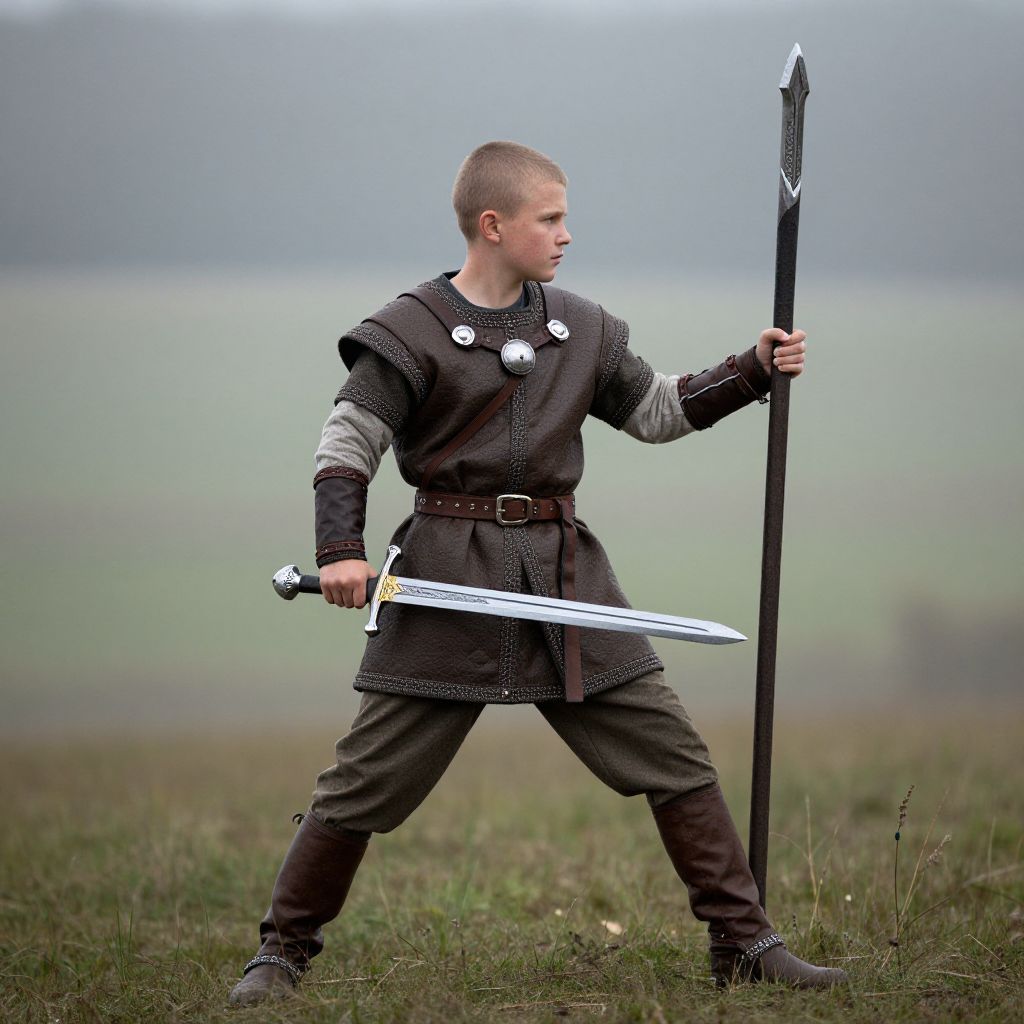 Fighting Viking Costume Boy, boy dressed in medieval clothing holding a sword and a staff