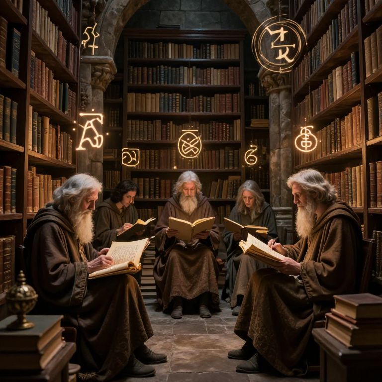 Photograph of four elderly men with white beards, dressed in dark, medieval-style robes, sitting in a dimly lit, arched library filled with tall bookshelves. They are deeply engrossed in reading open books, with glowing, mystical symbols floating above them. The men are seated on stone steps, surrounded by wooden bookshelves, creating an atmosphere of ancient wisdom and magic. The background is dark, with the warm light focusing on the men and their books, enhancing the mystical and scholarly ambiance.