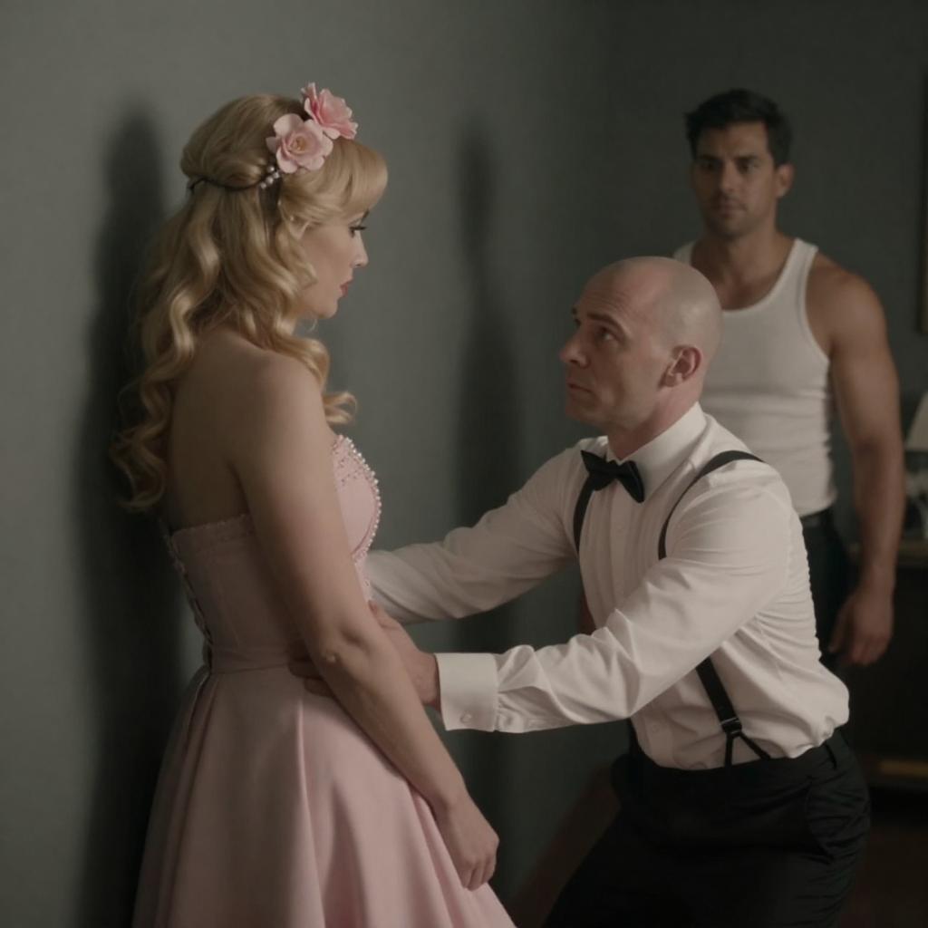 Photograph of a dramatic scene: a blonde woman in a pink dress with a flower headpiece pushes a bald man in a white shirt and black bow tie against a wall. A muscular man in a white tank top stands in the background, watching. Dim, moody lighting enhances the tension.