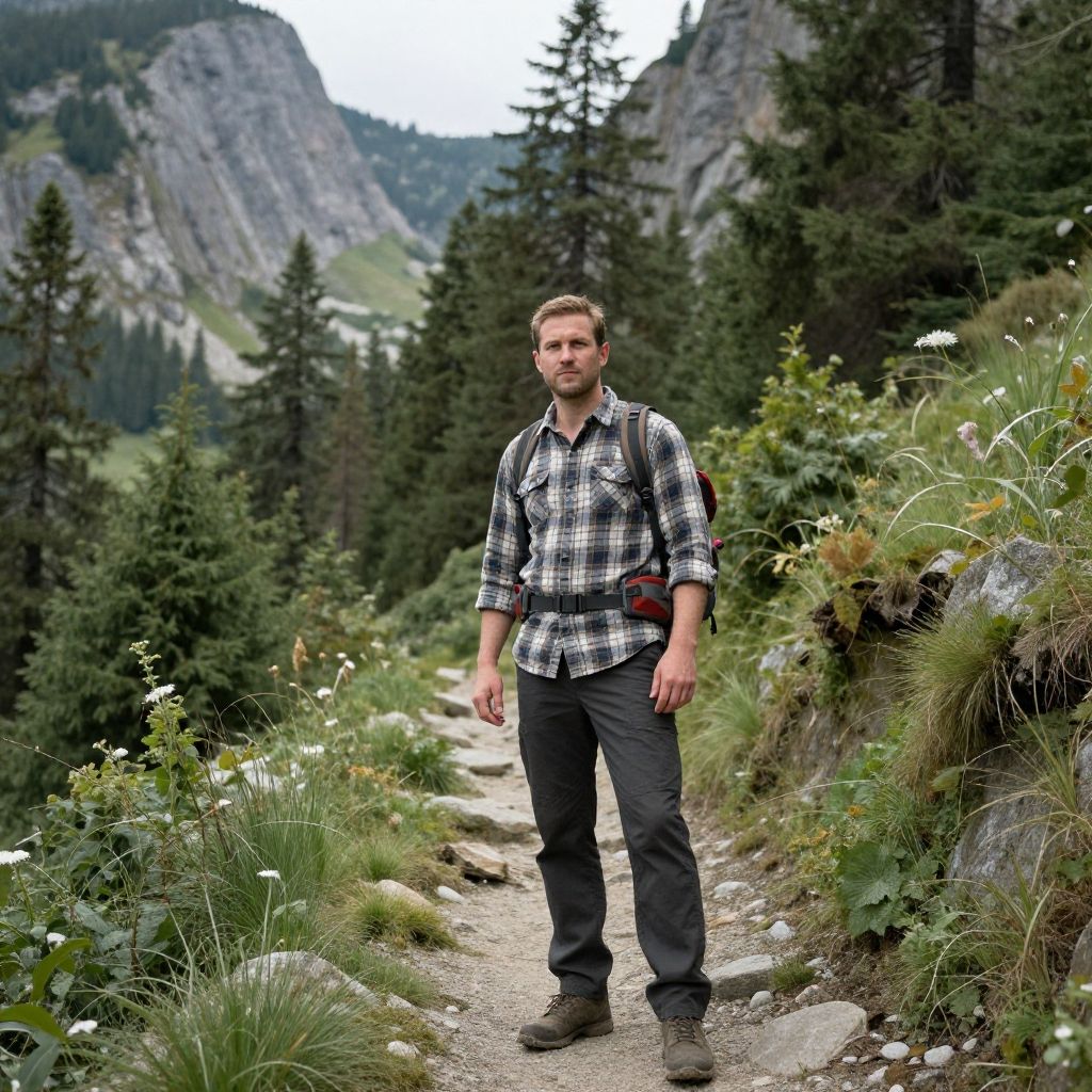 Photograph of a Caucasian man with short brown hair and a light beard, standing on a narrow, rocky mountain trail. He wears a black-and-white plaid shirt, dark gray pants, and brown hiking boots, with a red backpack strap visible. The background features dense evergreen trees, rocky cliffs, and a lush, green valley under an overcast sky. Wildflowers and grasses line the path on both sides. The man stands centered, looking directly at the camera with a neutral expression. The image captures a serene, natural mountain landscape.