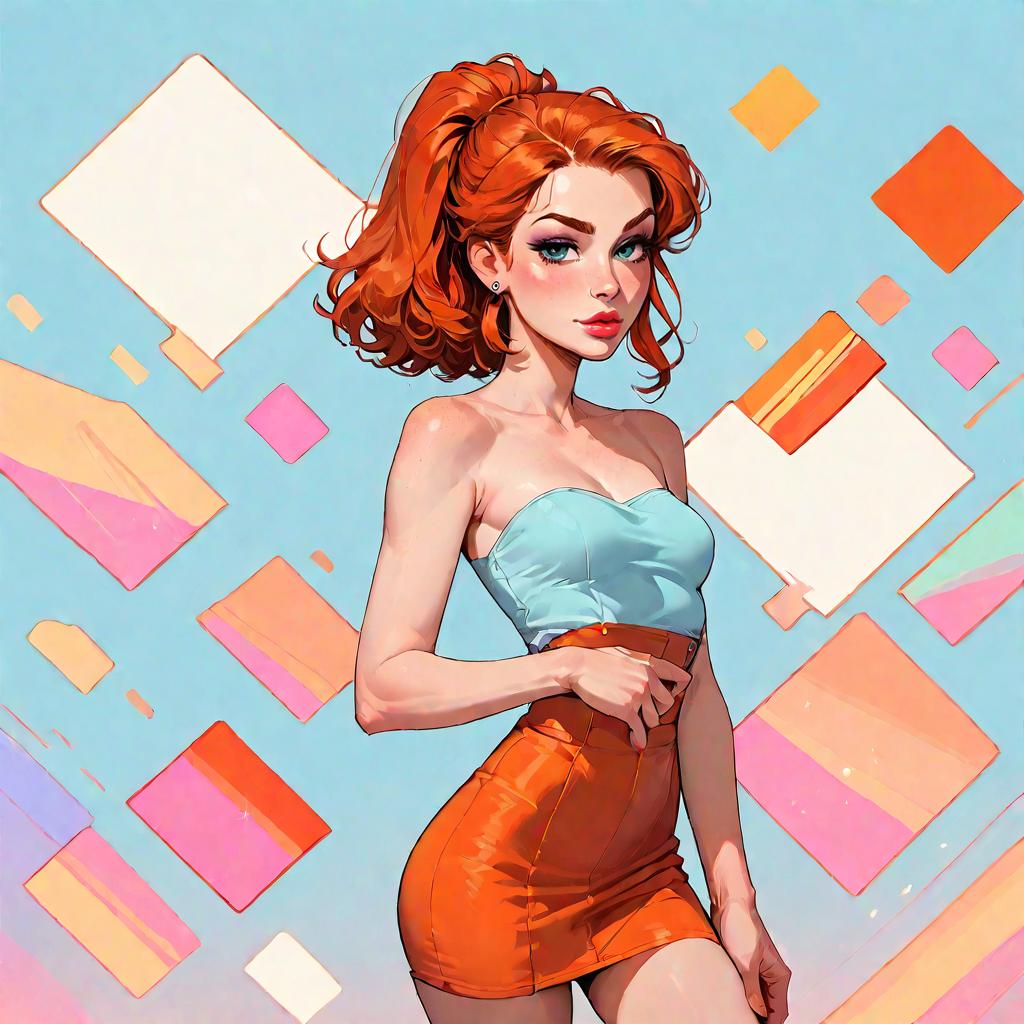 Score_9, score_8_up, score_7_up, score_6_up, flat color, makeup, solo, standing, bedroom eyes, looking at viewer, orange hair, ginger, ponytail, short dress, small breasts, strapless, sleeveless