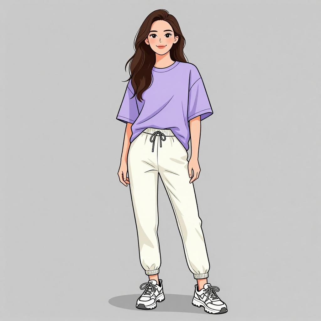 Woman with pretty face and pretty hair. smiling Woman, casual comfort, oversized grey sweatshirt, drop shoulder, batwing sleeves, crew neckline, black jogger pants, relaxed fit, cuffed ankles, black furry slide sandals, white studio background. --sref 1467