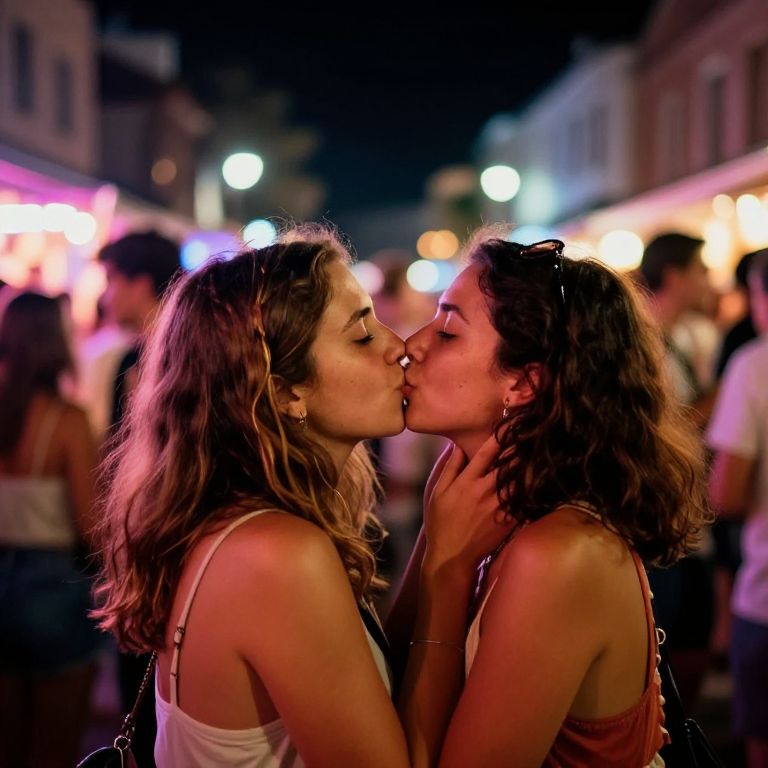 French kissing girls at a lively street festival at night, colorful lights and blurred movement around them, focus on their passionate kiss, vibrant and energetic mood
