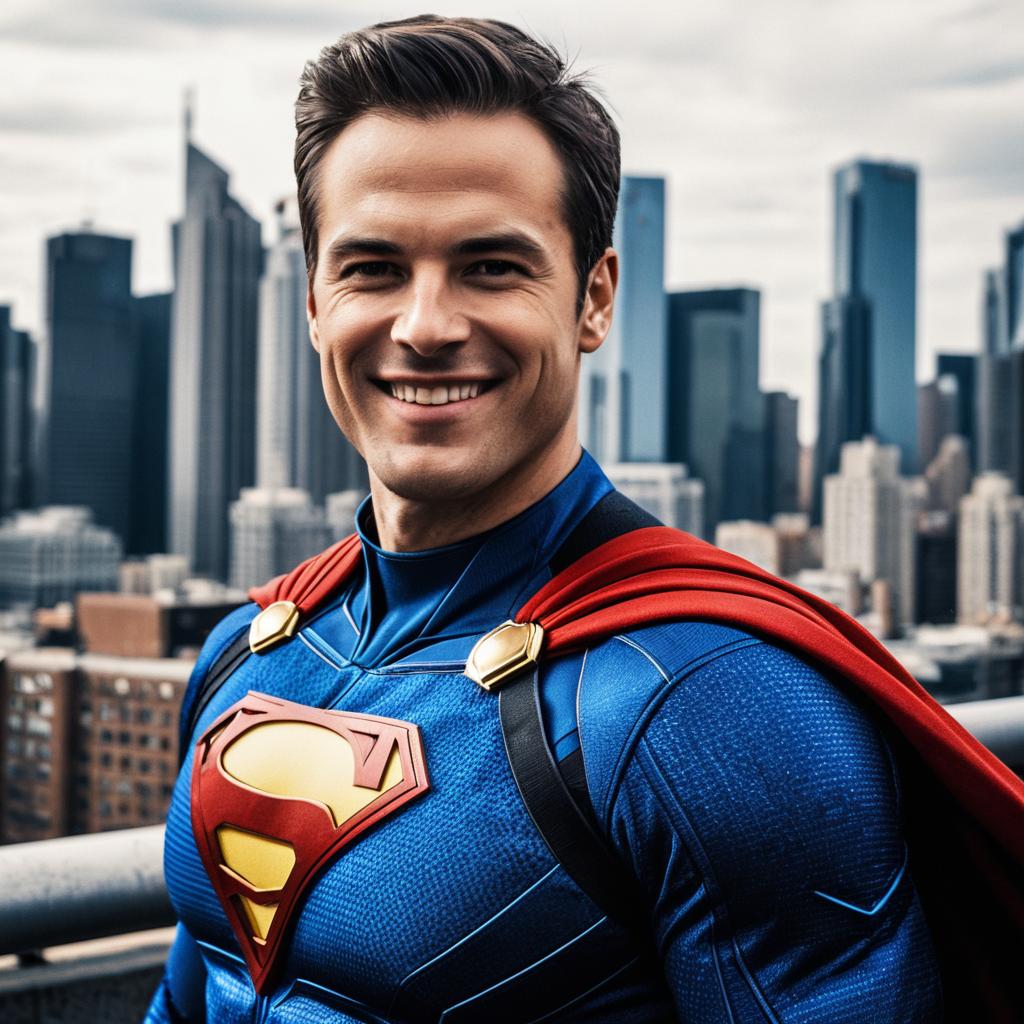 Close-up portrait of a smiling male superhero wearing a vibrant blue costume with a red and gold emblem on the chest and a red cape, standing in front of a city skyline with modern skyscrapers. The superhero has neatly styled dark hair and exudes confidence and strength.