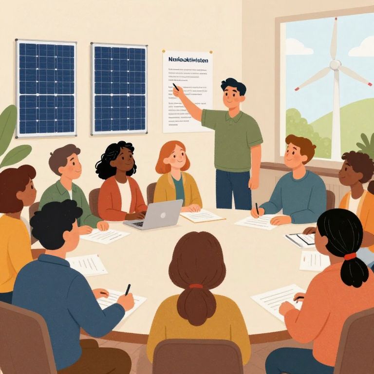 Klimaaktivisten organizing a community workshop on renewable energy solutions, indoors with posters on solar panels and wind turbines, diverse participants listening attentively, warm and hopeful atmosphere, digital illustration with soft textures and rich colors.