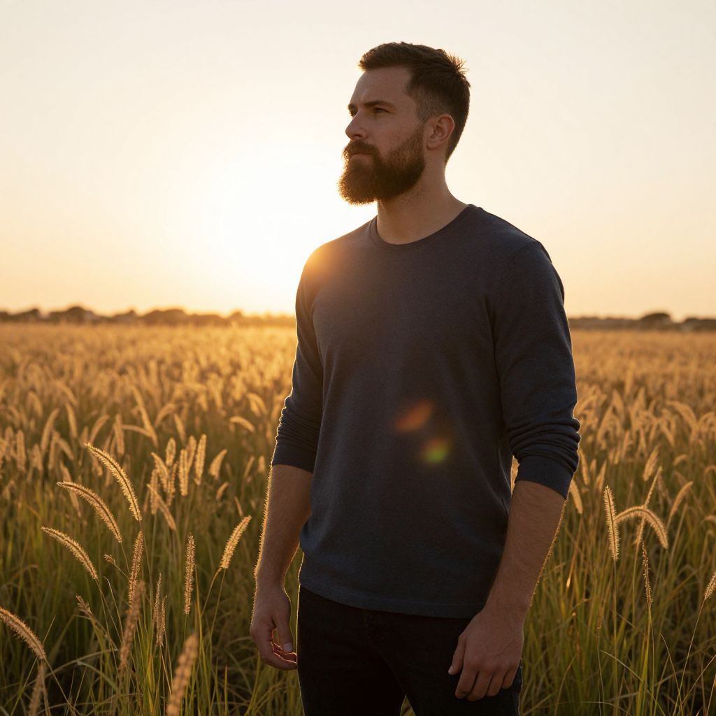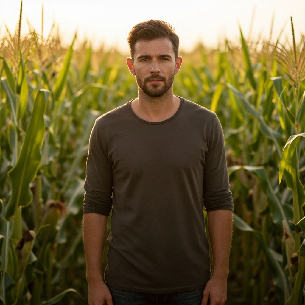 Photograph of a muscular, bearded white man with short brown hair standing in a sunlit cornfield. He wears a fitted, long-sleeve, dark gray shirt and blue jeans. The tall green corn plants surround him, with sunlight filtering through the leaves, creating a warm, golden glow in the background. His expression is serious and focused, with his arms relaxed by his sides. The overall setting is outdoors, with the natural light enhancing the vivid green of the corn and the man's defined physique. The image has a sharp, realistic style with a slightly warm color palette.