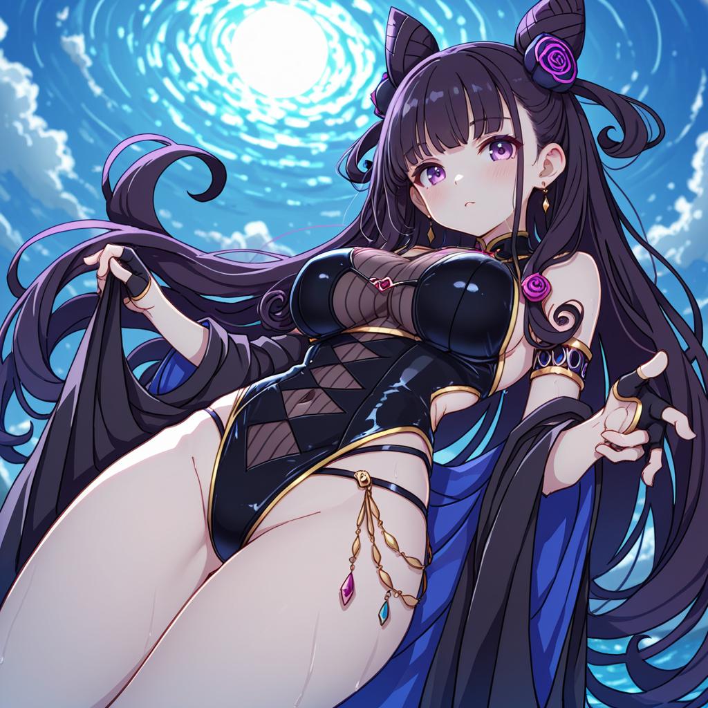 Murasaki shikibu (swimsuit rider) (first ascension) (fate), fate/grand order, 1girl, purple eyes, long hair, purple hair, tied hair, black hair, hair flower, large breasts, thighs, covered navel, black one-piece swimsuit, highleg swimsuit, half gloves, fingerless gloves, black gloves, bare shoulders, gold trim, armlet, shawl, by artist kame (kamepan44231), dark_illustrious