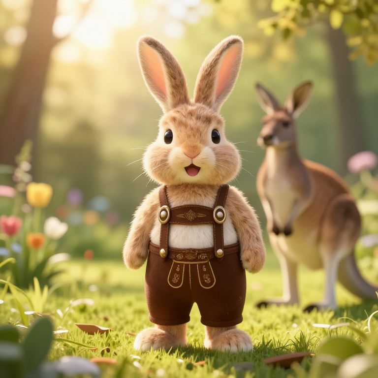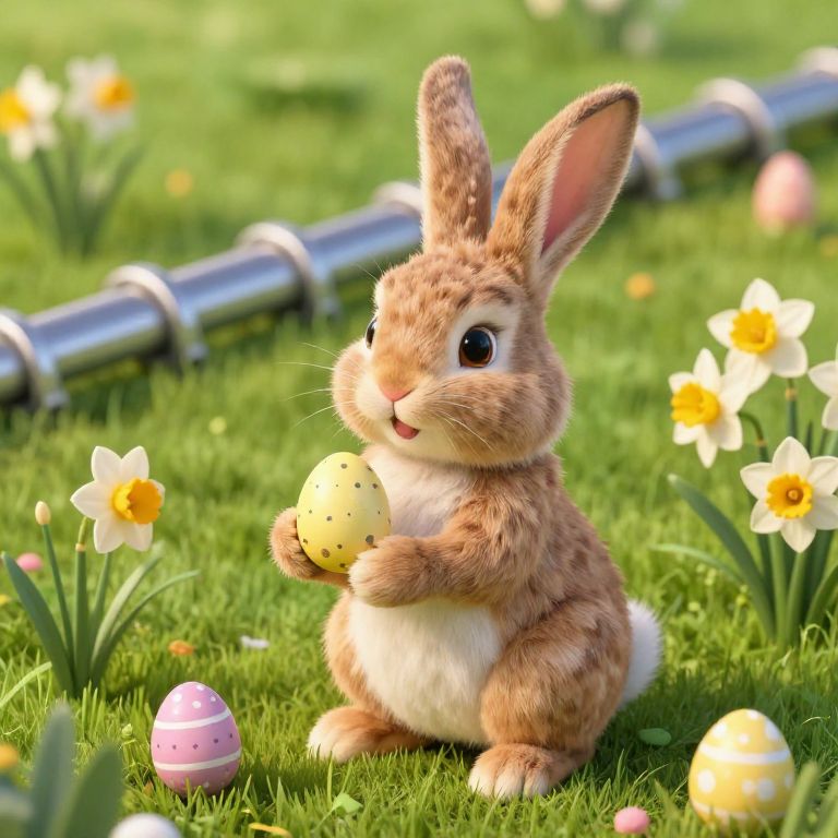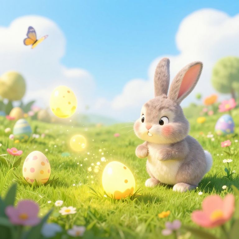Easter bunny pooping eggs in a fantasy meadow, eggs shaped like glowing orbs rolling gently away, the bunny with a cheeky expression, surrounded by butterflies and spring flowers, bright and colorful