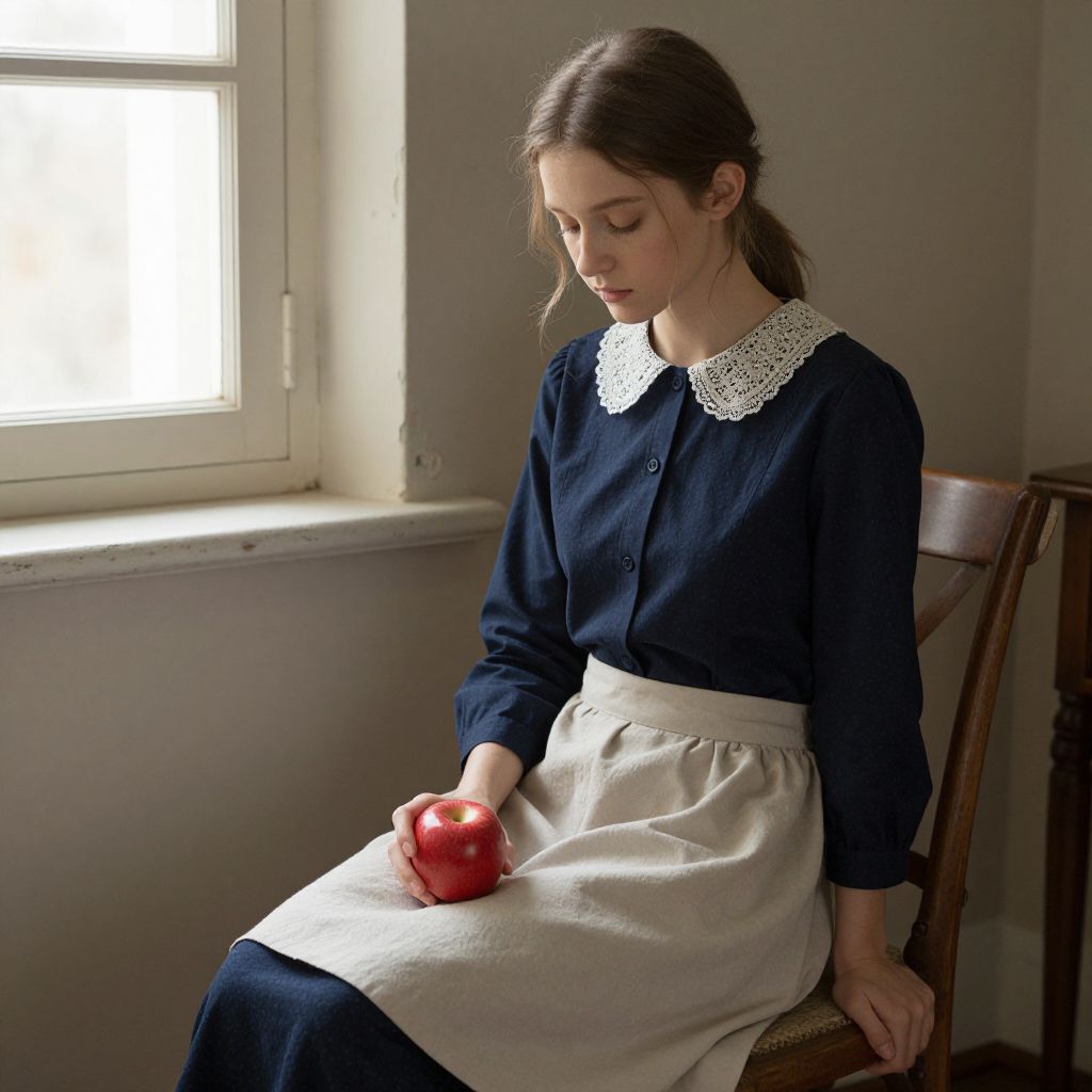 Seated in a dimly lit room, a young woman dressed in a dark blue blouse with a lace collar and a cream-colored apron holds a vibrant red apple, her gaze directed downward as she sits gracefully on a wooden chair near a window with peeling paint.