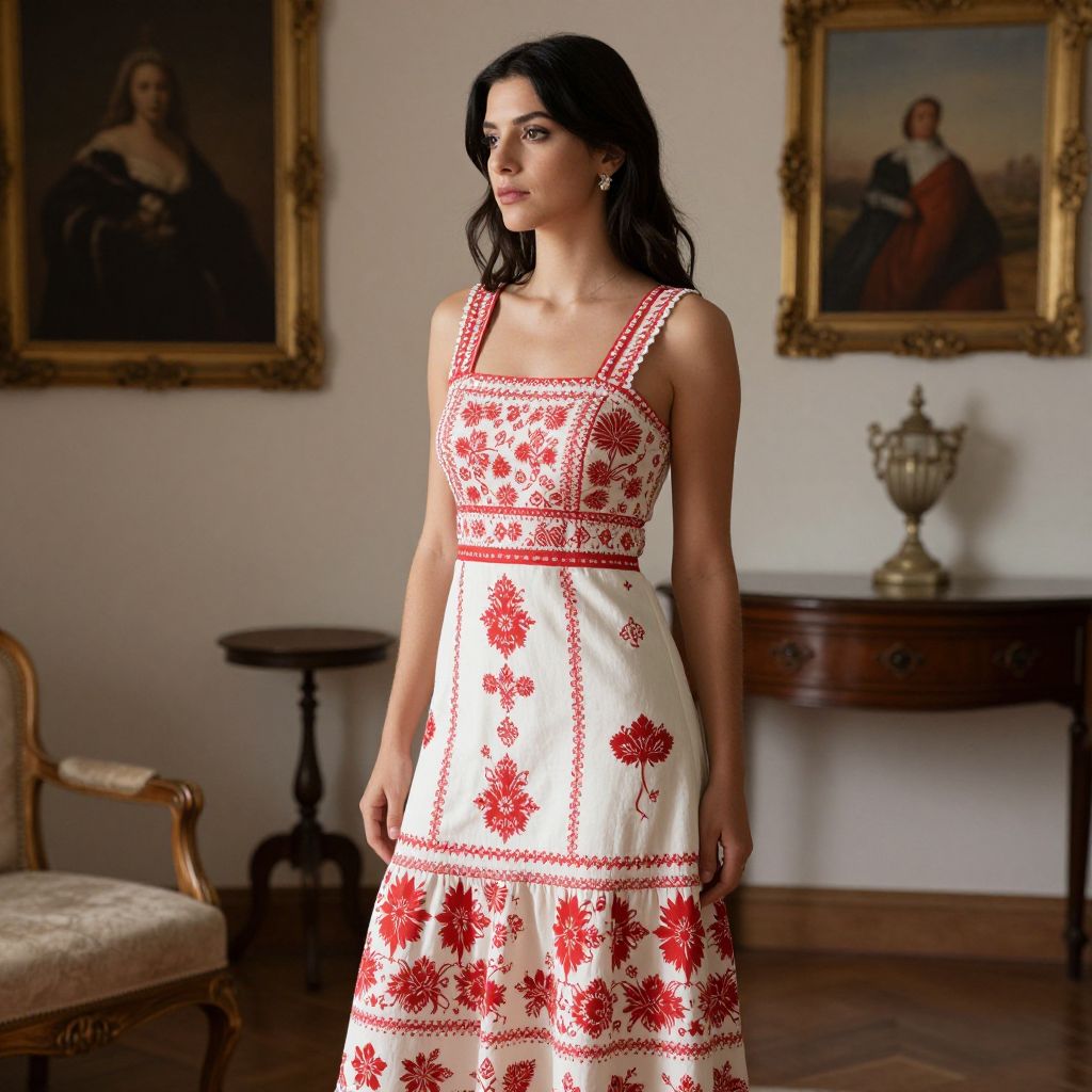 Photograph of a young woman with long, black wavy hair, light skin, and delicate features. She wears a white dress adorned with red floral embroidery on the bodice, sleeves, and hem, with a square neckline and short sleeves. The dress has a fitted waist and a slightly flared skirt. She stands in a classical, elegantly furnished room with wooden floors, white walls, and two framed portraits in ornate gold frames hanging on the wall behind her. A wooden side table with a decorative urn and a small round table are in the background. An upholstered chair with a beige fabric is partially visible on the left.