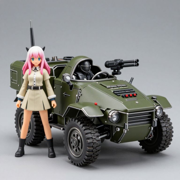 The image showcases a meticulously crafted designer toy, featuring a metal slug vehicle figure from the Maschinen Krieger series. The vehicle, painted in a muted olive green, is equipped with various mechanical components and details, including a cockpit with a pilot inside, a mounted gun, and a series of buttons and switches. The figure stands to the left of the vehicle, dressed in a beige outfit with a distinctive pink and white mane, adding a touch of whimsy to the otherwise mechanical design. The overall composition is balanced, with the figure and vehicle positioned in harmony, creating a dynamic and engaging visual narrative. The textures of the vehicle's armor and the figure's clothing are clearly defined, enhancing the realism and depth of the scene.