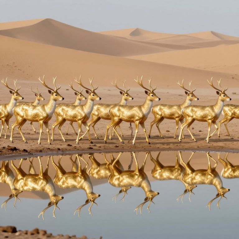 A shimmering herd of golden deer strides across a desert landscape, their metallic forms casting perfect reflections in a tranquil pool below, evoking a surreal, computer-generated vision where past and future converge in endless mirror-like symmetry.