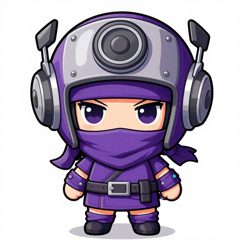 Chibi-style drawing of a determined ninja with purple outfit, helmet featuring a circular center, and headphones, standing against a white background.