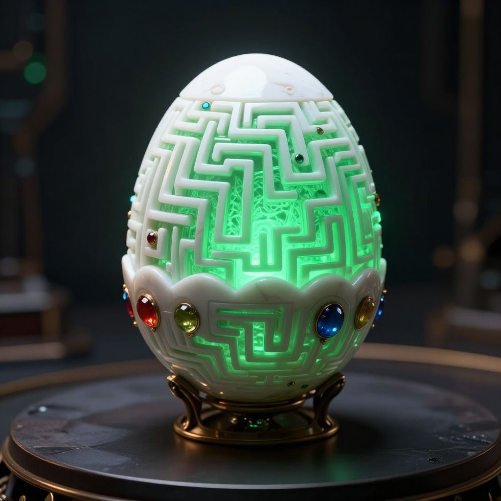 Intricately detailed White marble Faberge egg with green glowing Labyrinthine carvings, and adorned with colorfull gemstones, On a table, dark sci-fi background, soft cinematic lighting, 8k, unreal engine, octane render, volumetric lighting, soft area lighting, volume scattering, ral-frctlgmtryCyberpunk Meca, realistic, unknown, mysterious, highly detailed, dynamic pose, 3/4 view, from a higher angle