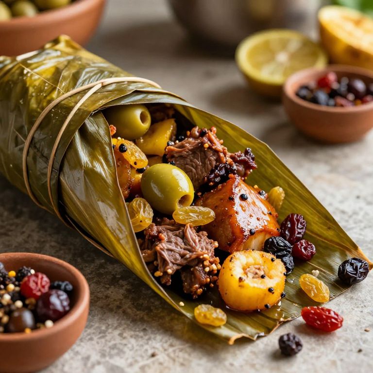 Hallacas, traditional Venezuelan dish wrapped in plantain leaves, vibrant ingredients spilling out, rich colors of seasoned meats, olives, raisins, and spices, rustic kitchen background, warm natural lighting, festive holiday atmosphere, detailed texture