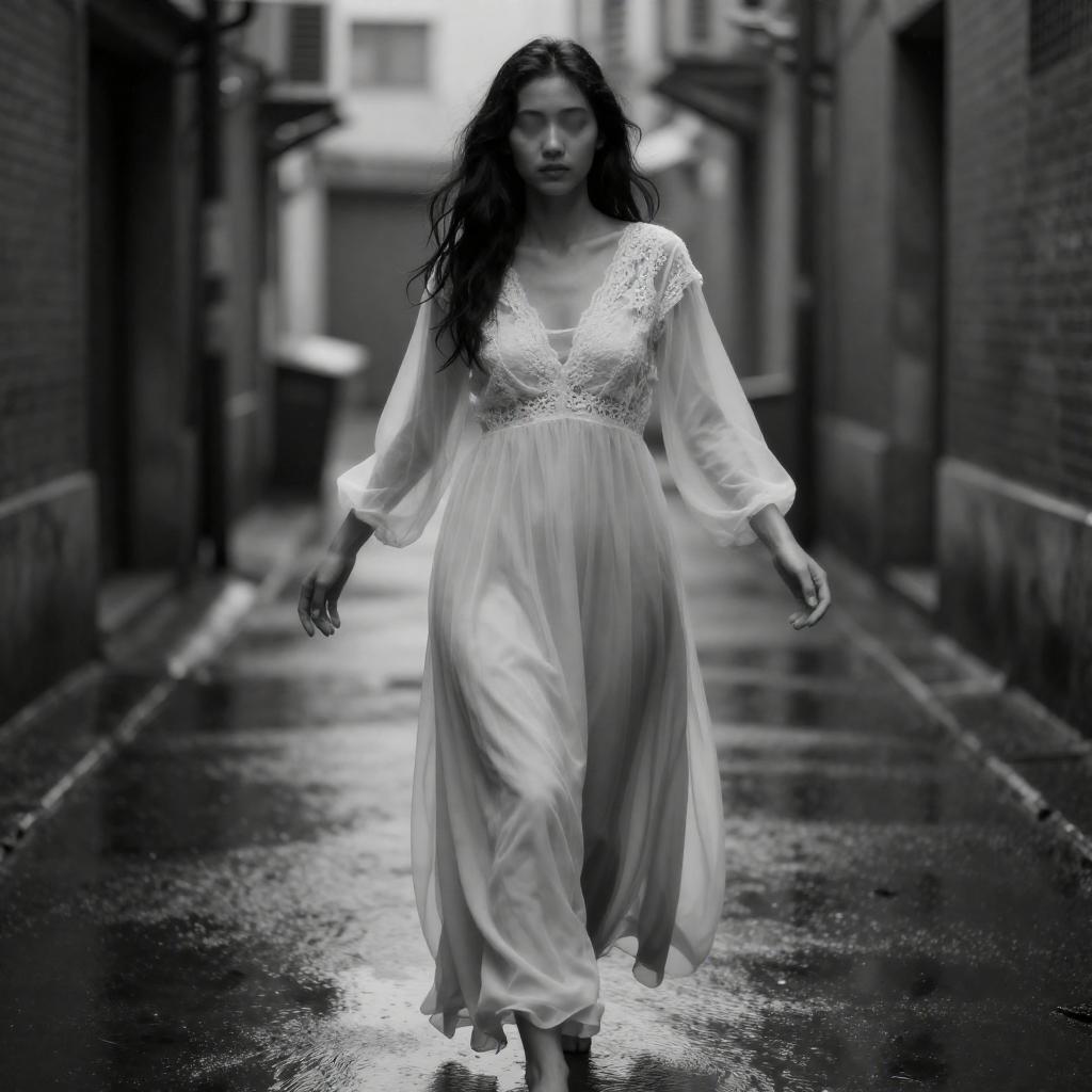 Black and white photograph of a woman with a blurred face, standing in a dimly lit, rainy alley. She wears a long, flowing, semi-transparent dress with delicate lace detailing at the top. Her arms are slightly outstretched. The ground is wet and reflective. Light from behind creates a glowing effect around her.