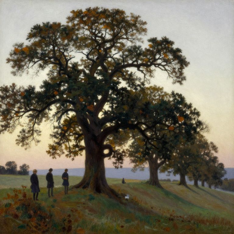Photorealistic painting of sunset scene with silhouetted people walking under large, shadowed oak trees on a grassy hill. Soft, past