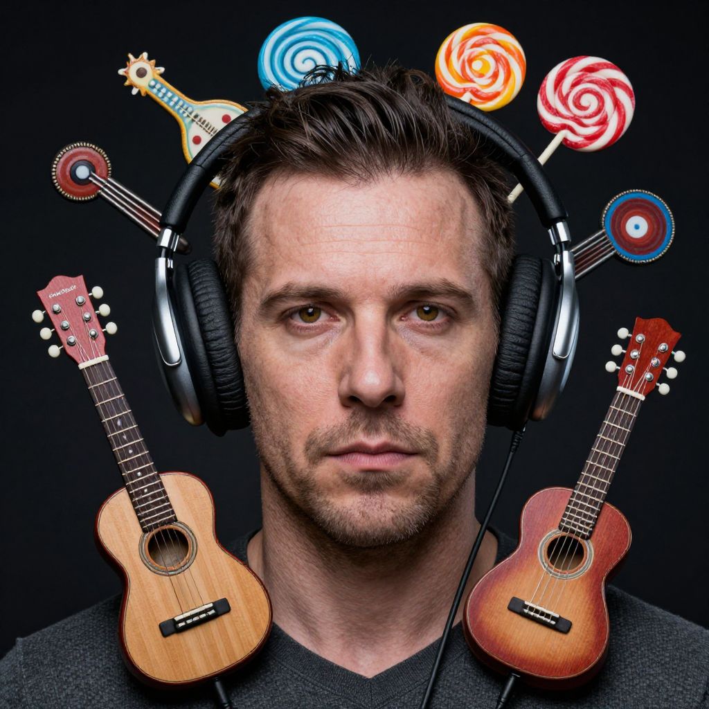 A hyper-detailed portrait of a man with headphones, adorned with colorful musical instruments and candy, against a dark background.