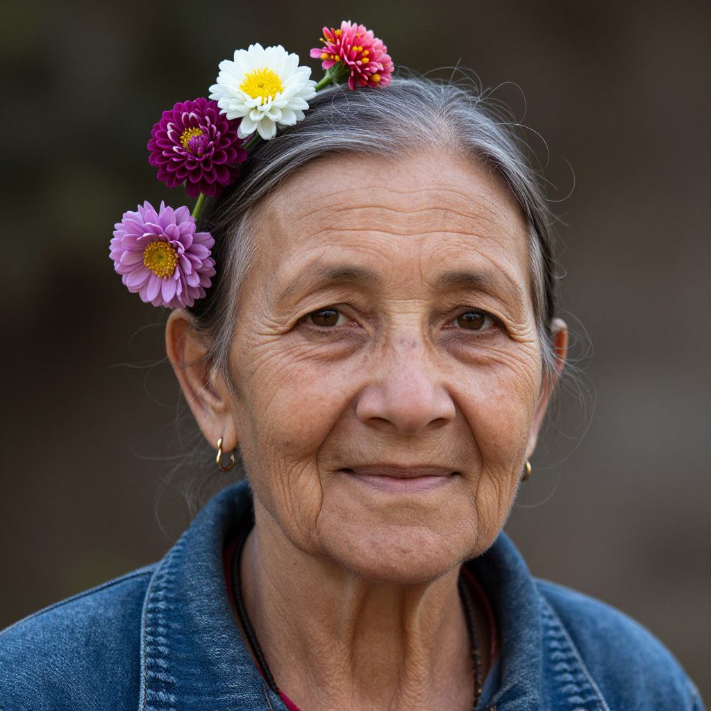 Photograph of an elderly woman with dark hair, adorned with a colorful flower crown, wearing a blue denim jacket, smiling softly against a blurred brown background