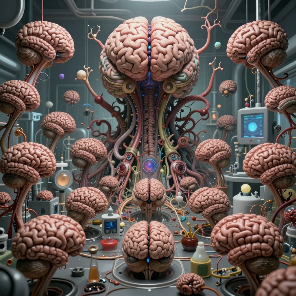 An (extremely detailed:1.0), vast, weird, chaotic cult landscape of crazy (genetically engineered) brains in a research lab. (hyper-realistic), (overwhelmingly captivating), real intricately elaborate and (insanely strange:1.0) brain alteration with (incredibly absurd:1.0) brain anatomy. Random (Occult Chaos:1.0) brain nonsense. Hyper-detailed Photography