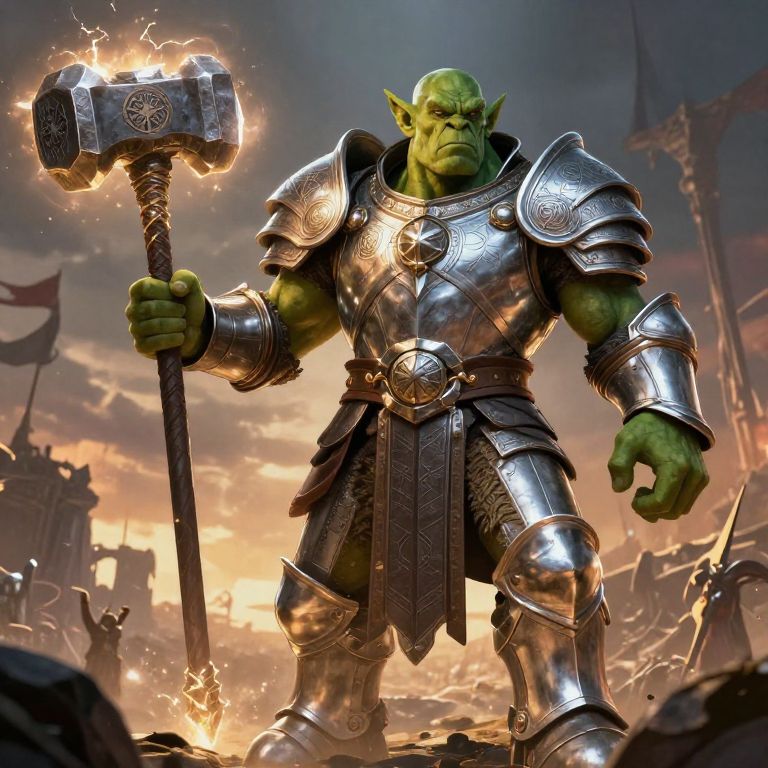 Digital artwork of a green-skinned, muscular orc warrior in shining silver armor, holding a glowing, electrified war hammer, standing on a battlefield at