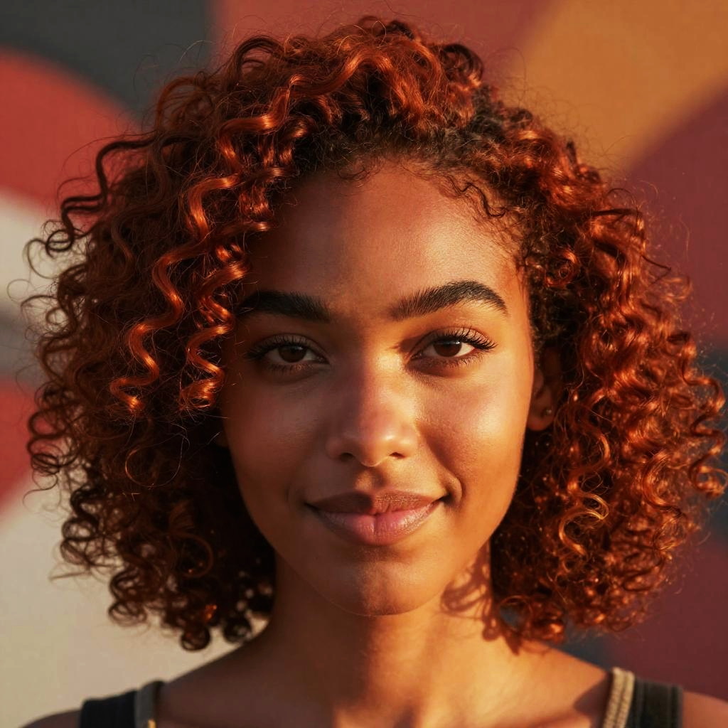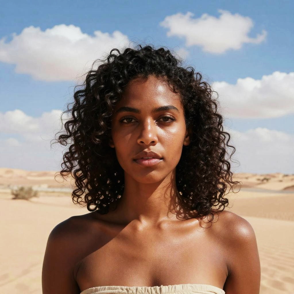 Photograph of a young Black woman with medium-brown skin and curly black hair, standing in a desert with sandy dunes and a bright blue sky with scattered white clouds. She has a serious expression and is wearing a strapless, off-white top that reveals her shoulders and upper chest. The sunlight highlights her skin's natural sheen. Her face is centered in the frame, and the background is slightly blurred, emphasizing her as the focal point. The image has a natural, candid style.