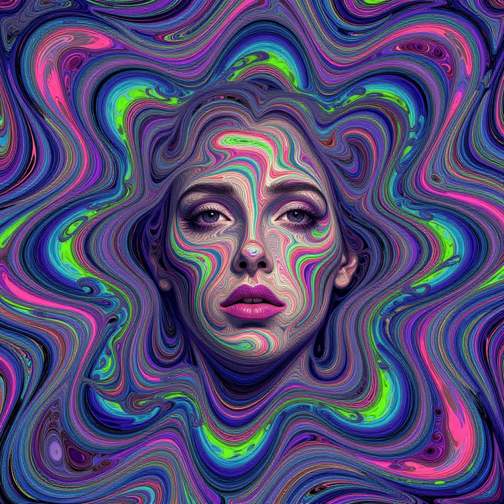 Digital artwork of a woman's face with swirling, vibrant neon colors (pink, blue, green, purple) in abstract, hypnotic patterns, blending