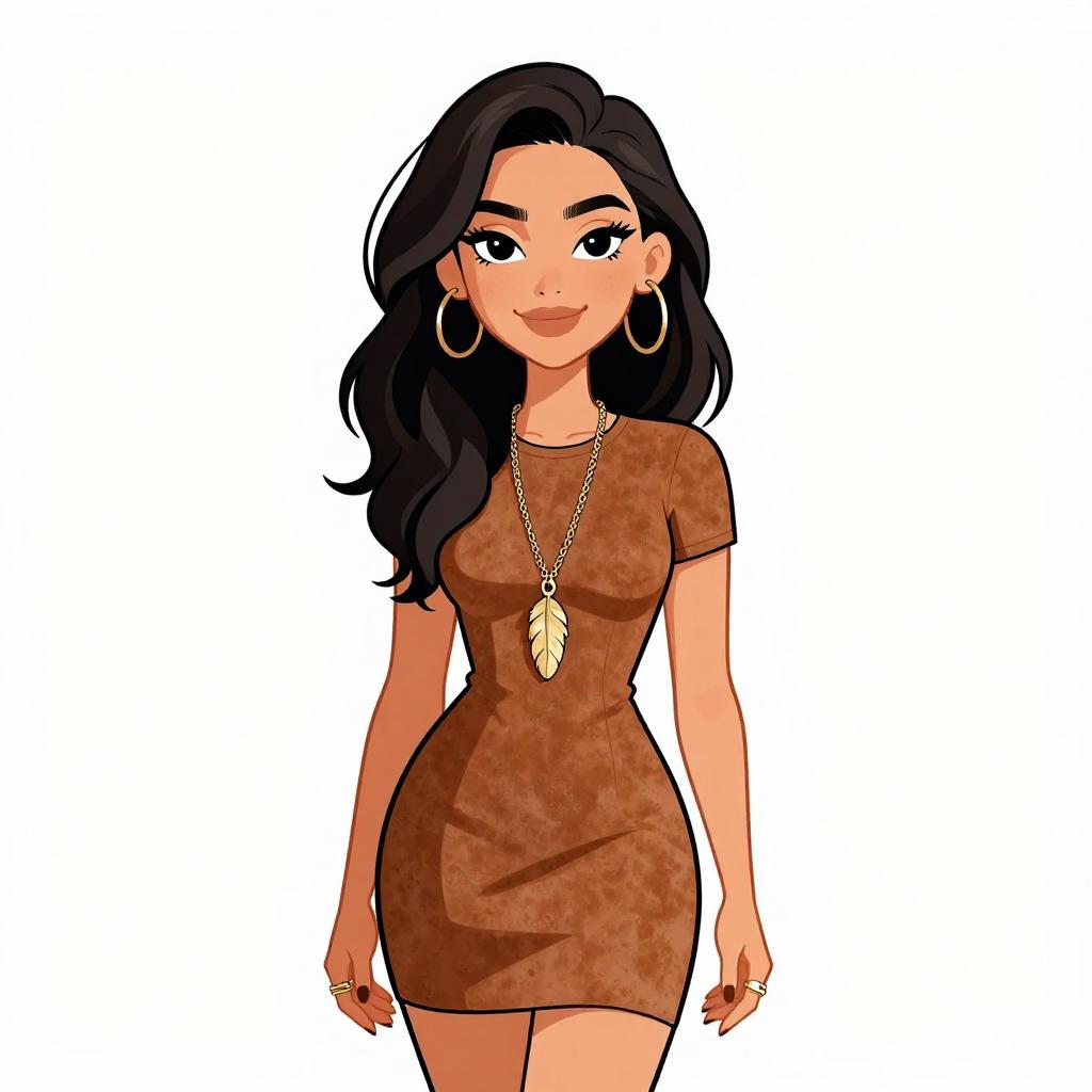 Woman with pretty face and pretty hair. smiling Woman, bohemian, suede mini dress in a soft brown, crew neckline, short sleeves, form-fitting, feather pendant necklace on a long chain, multiple rings on fingers. --sref 1467