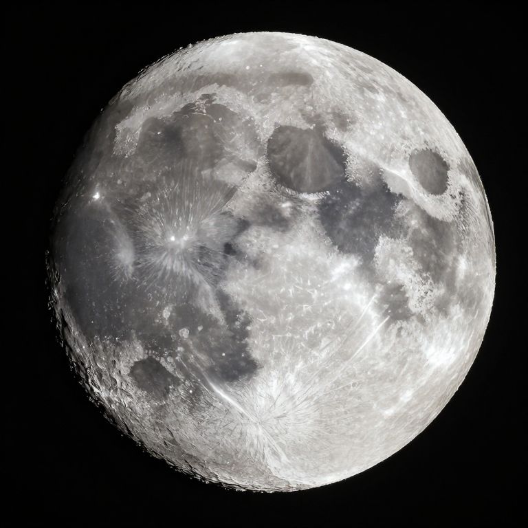 Photograph of a detailed, full moon against a black night sky, showcasing its craters, mountains, and bright lunar surface textures.