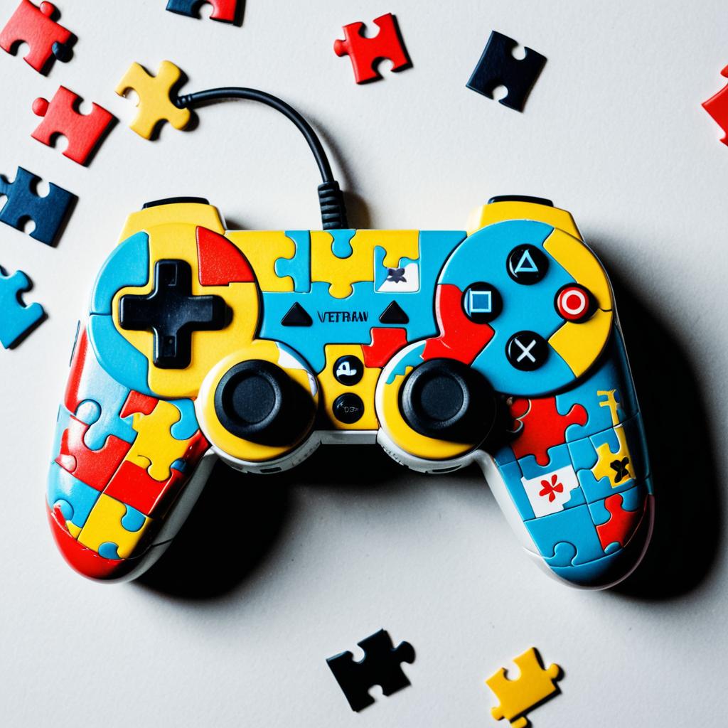 A colorful video game controller made of puzzle pieces, veterans support, styled in a playful and whimsical way.