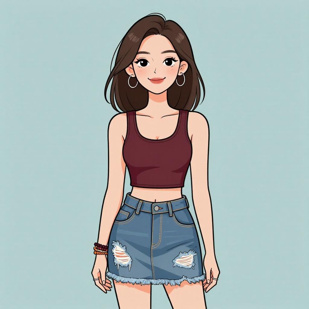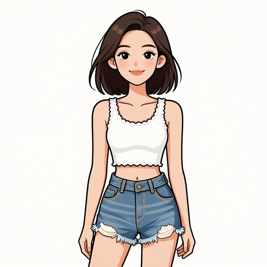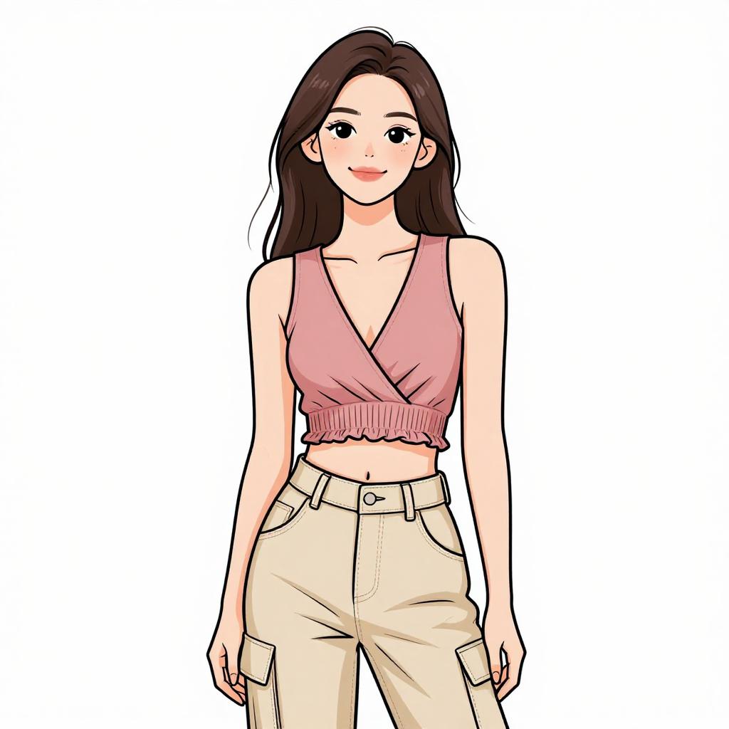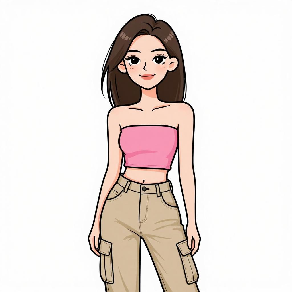 Woman with pretty face and pretty hair. smiling Woman, casual streetwear, strapless pink tube top with a midriff cut-out, high-waisted khaki cargo pants with side pockets and distressed details, white background --sref 1467