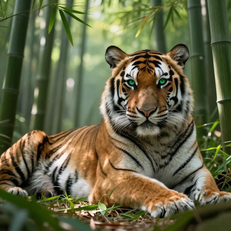 Envision a hyper-realistic portrait of an enigmatic Siberian tiger, its majestic form lounging gracefully amidst a serene bamboo forest. The tawny fur, shimmering in dappled sunlight filtering through the canopy, is rendered with meticulous detail to showcase its velvety texture and subtle variations. From a unique 'bug's-eye view' perspective, it lazily gazes towards the camera, its mesmerizing emerald eyes exuding an air of wisdom and mystery that draw viewers into this enchanting scene. The vibrant green foliage surrounding the tiger is so lifelike that one can almost hear the soft rustling of leaves in the gentle breeze, creating an emotional gradient that blends tranquility with awe.