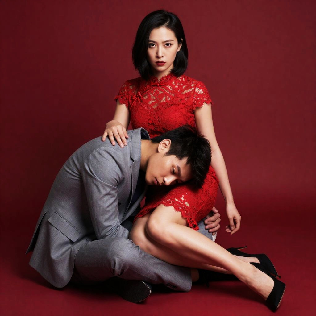 Photograph of an Asian woman in a red dress with short sleeves and high collar, kneeling, and an Asian man in a gray suit, bow tie, and white shirt, crouching, kissing her right foot. Red background, woman's intense gaze, man's head bowed. Woman wears black high heels, man's right hand holds her ankle.
