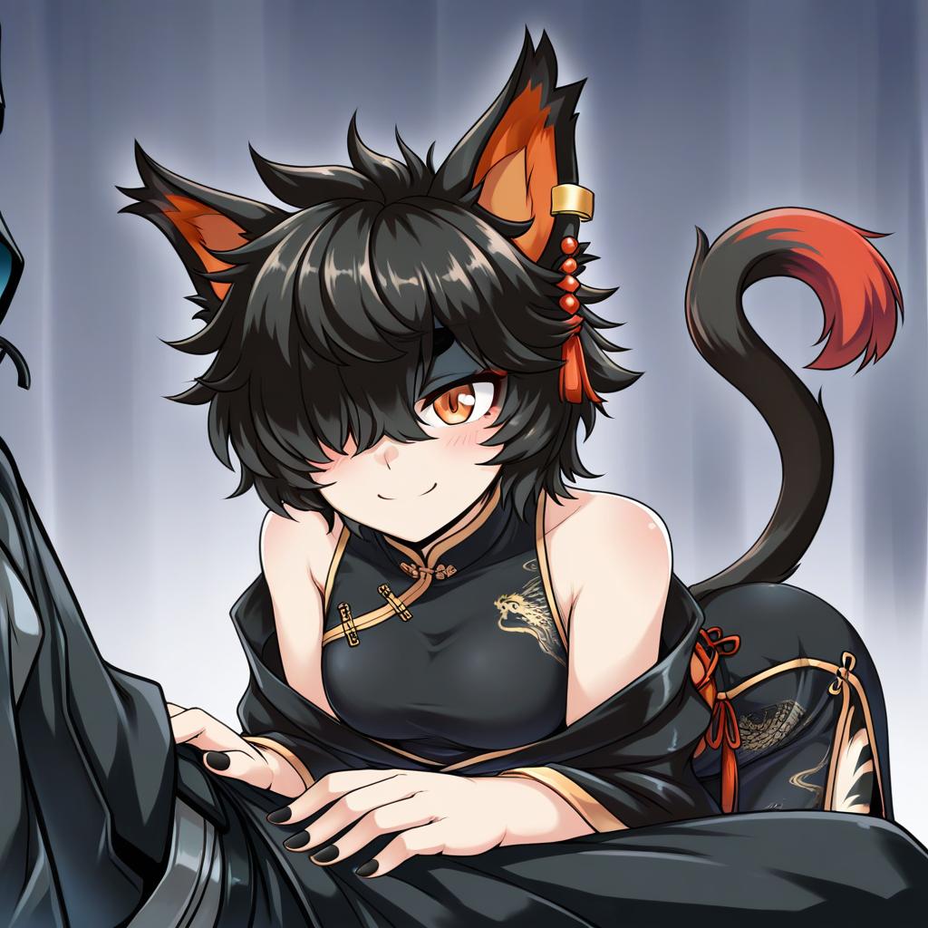 Digital artwork of an anthropomorphic cat boy character with black hair, yellow slit pupils, and cat ears with orange inner fur and ear piercings. Wearing a black traditional Chinese dress with golden dragon embroidery and black nails. The character has a black and orange tail and hair partially covers one eye.