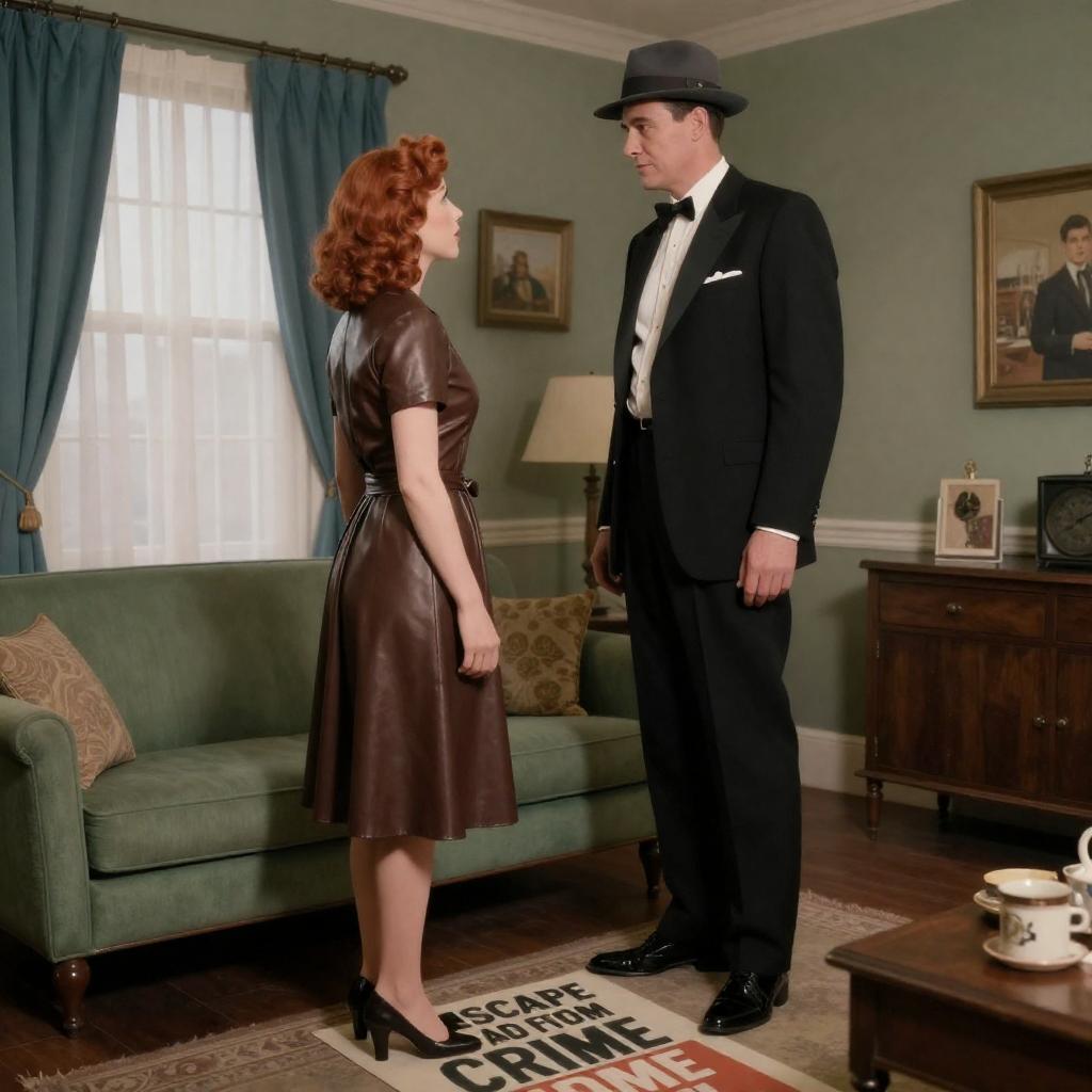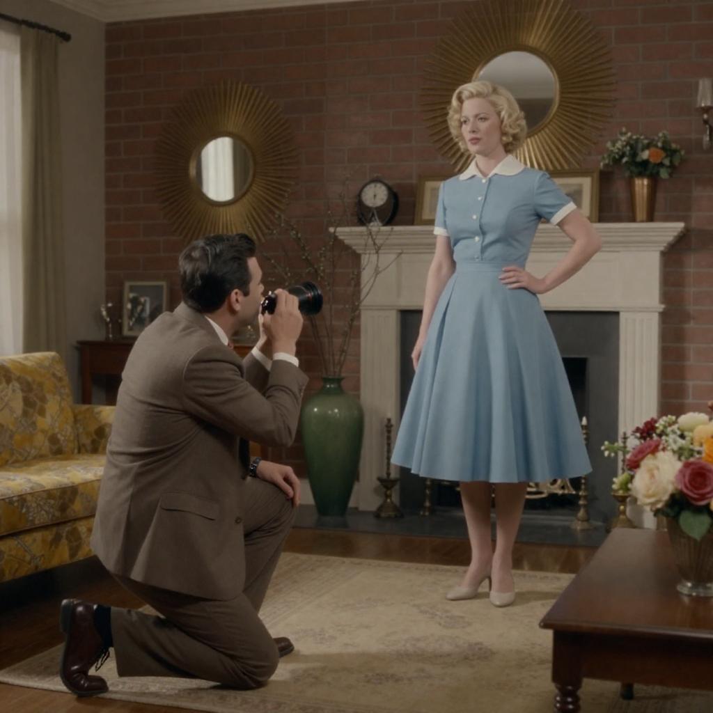 Photograph of a mid-20th century living room. A man in a brown suit and tie, with short dark hair, kneels filming a blonde woman in a blue dress with a full skirt, standing confidently. The background features a brick wall with sunburst mirrors, a fireplace, and a large green vase with tall branches. A table with a floral arrangement is in the foreground.