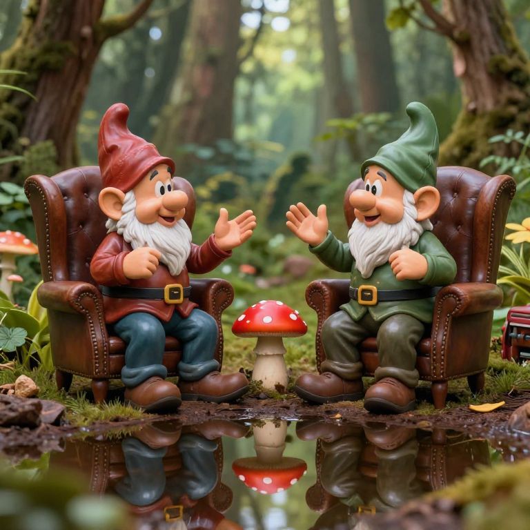 Two garden gnomes, seated in plush brown leather wingback chairs, engage in animated conversation, gesturing enthusiastically as they sit amidst a vibrant forest setting, with a reflective puddle below them mirroring their surroundings and a whimsical red toadstool growing between them.