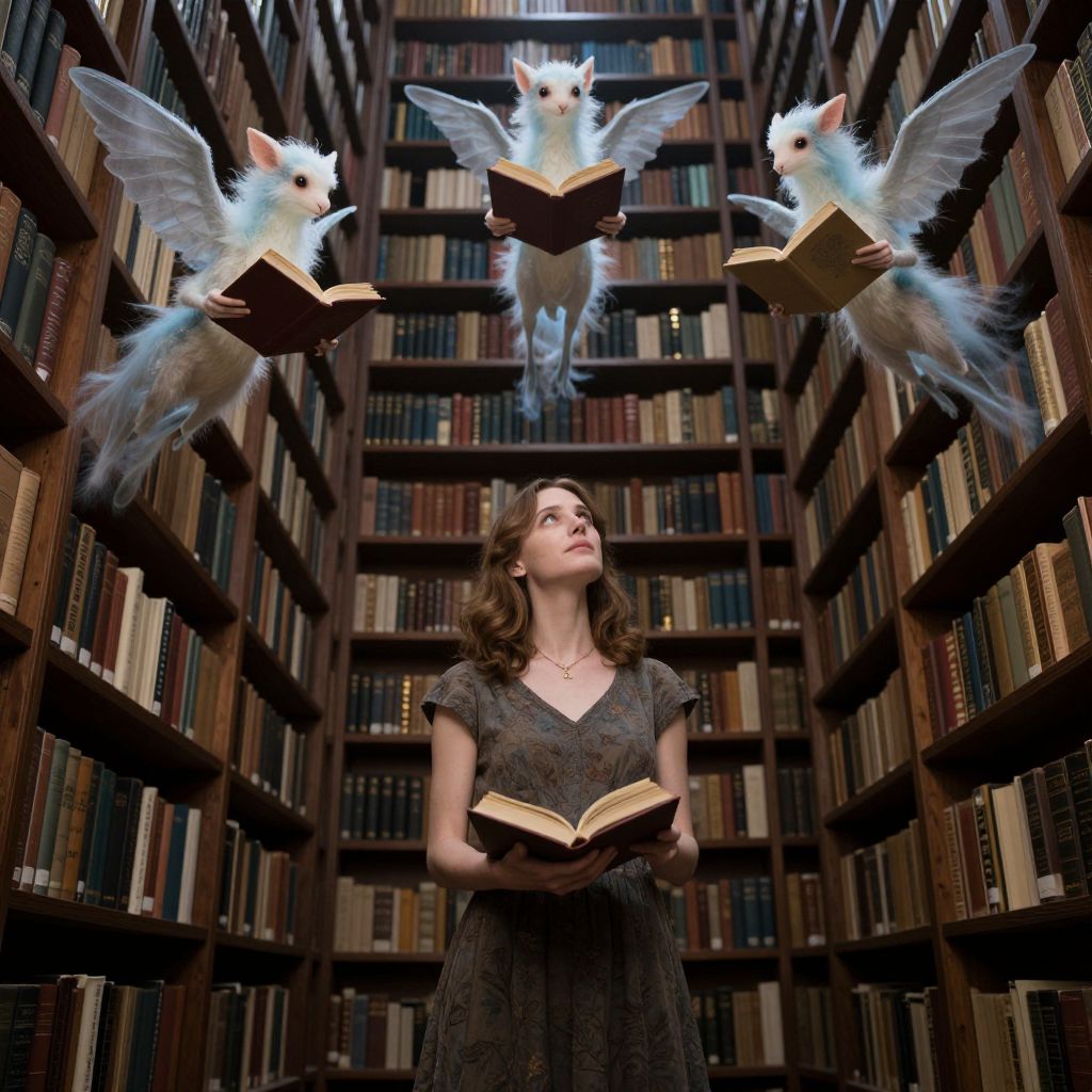 Intrigued by the surreal ambiance, a woman stands amidst towering bookshelves in a dimly lit library, her gaze fixed upward as three ethereal creatures float gracefully, each cradling open books, while she holds another volume in her hand, suggesting a magical realm where knowledge takes flight.