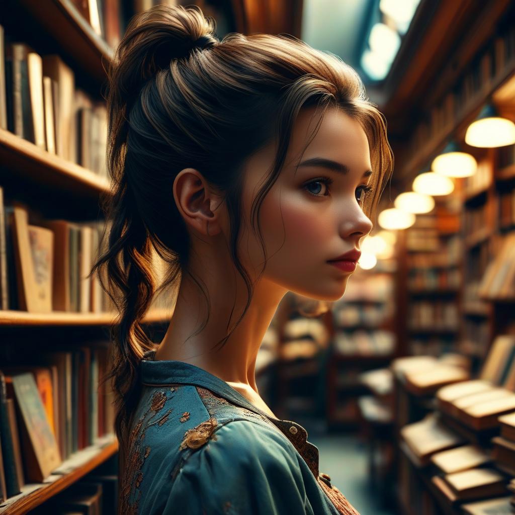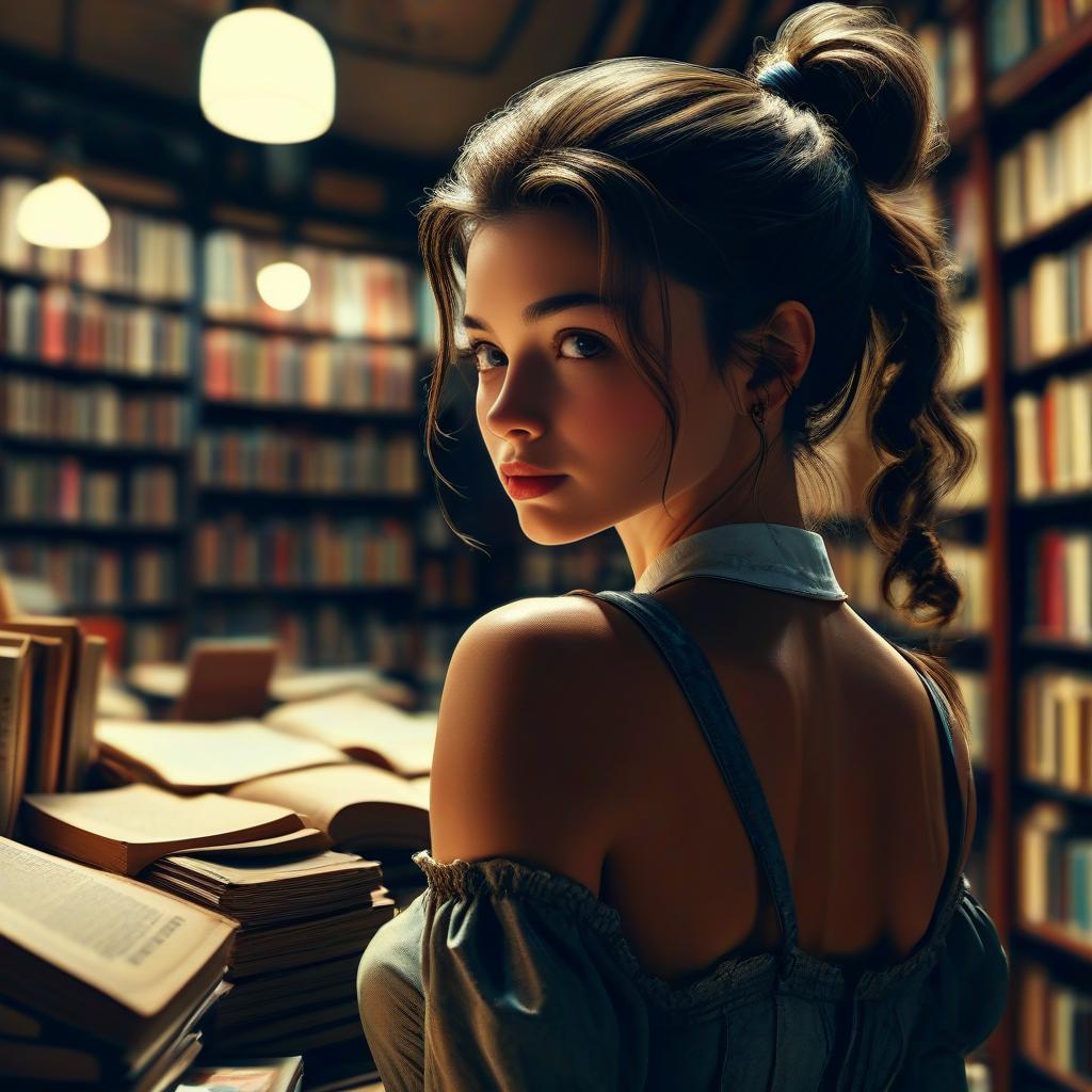 Photo by herge, Butt Focus, Gap View, Closeup, amazing quality, masterpiece, best quality, hyper detailed, ultra detailed, perfect anatomy, portrait, majestic, awesome, inspiring, A female brunette vintage in a vintage bookstore with moody lighting, Messy ponytail, light Smile, street style